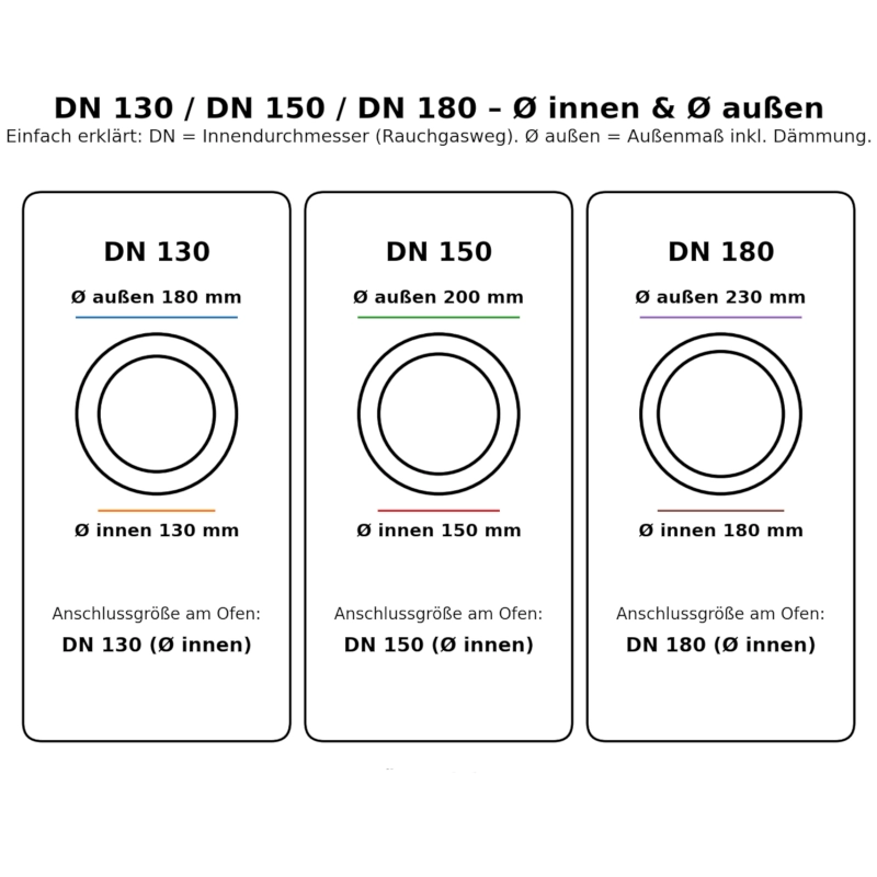 Bitte wähle den Nenndurchmesser passend zum Anschluss deiner Feuerstätte bzw. zur Planung des Abgassystems. Wenn du unsicher bist, schreib uns kurz – wir helfen dir bei der richtigen Dimensionierung.