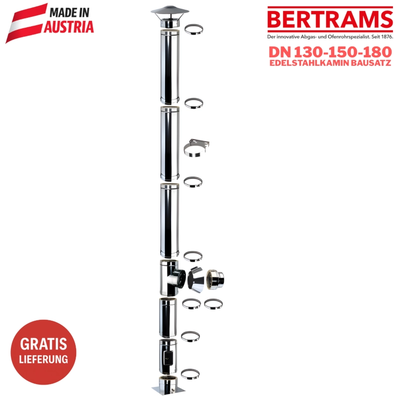 Dieser Edelstahlkamin Bausatz (Außenschornstein) doppelwandig stammt vom österreichischen Hersteller Bertrams und wird in Österreich (Wien) gefertigt. Das bedeutet: zuverlässige Verarbeitung, kurze Wege und vor allem eine saubere Dokumentation für den Einsatz im österreichischen Markt.