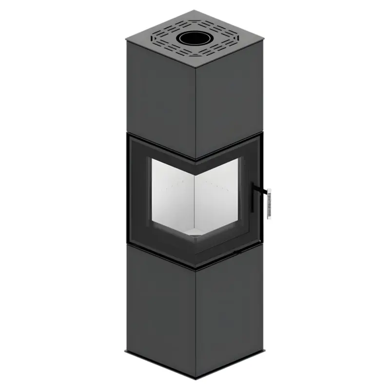 Moderner freistehender Kamin mit großem Eckglas und eleganter, schlanker Oberfläche.