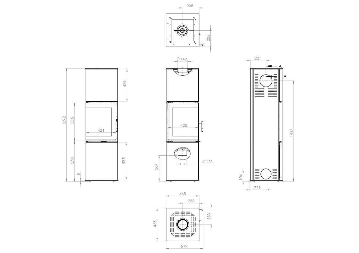 | Durchmesser des Schornsteinkopfs (mm) | 150 |